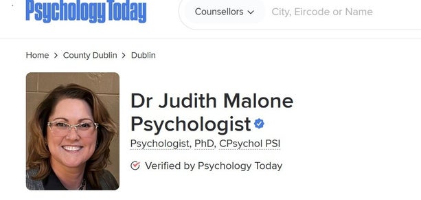 Dr Judith Malone, Chartered Counselling Psychologist, C.Couns.Psychol.,Ps.S.I. (she, her).